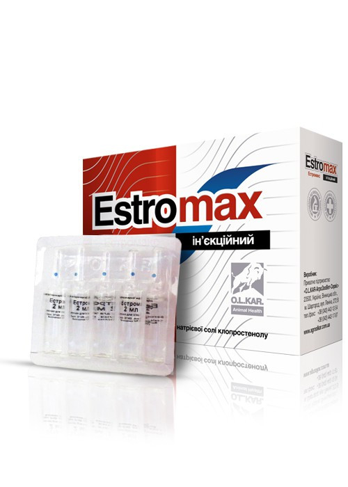 Эстромакс для инъекций СОСТАВ : 1 мл препарата содержит 0,25 мг натриевой соли клопростенола. ФАРМАКОЛОГИЧЕСКИЕ СВОЙСТВА. Клопро- стенол является синтетическим аналогом простаг- ландина Ф2-альфа, который в период лютеиновой фазы полового цикла у самок вызывает регрессию желтого тела и способствует росту и развитию фолликулов.